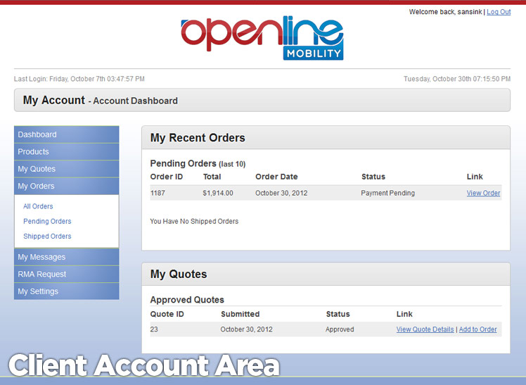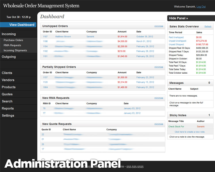 A fully custom wholesale management system built from the ground up. Manage purchase orders, vendors, products, orders, returns and retail clients. Built in sales reporting system, sales alerts and messaging system. Retail clients can manage their quotes, orders and returns from their own account profile.